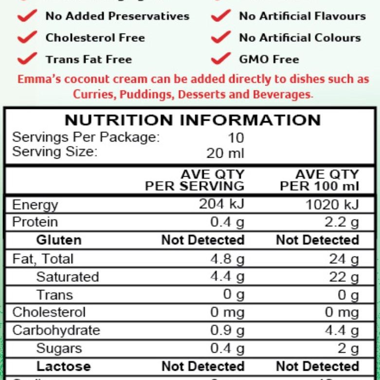 Emma UHT Coconut Cream 200ml has all the goodness of coconut in a packet. It is a coconut cream that contains 24% coconut fat that makes it a perfect ingredient for cooking and baking. Emma Coconut Cream is made without added preservatives and artificial flavours while being lower in fat which makes Emma the healthier choice!